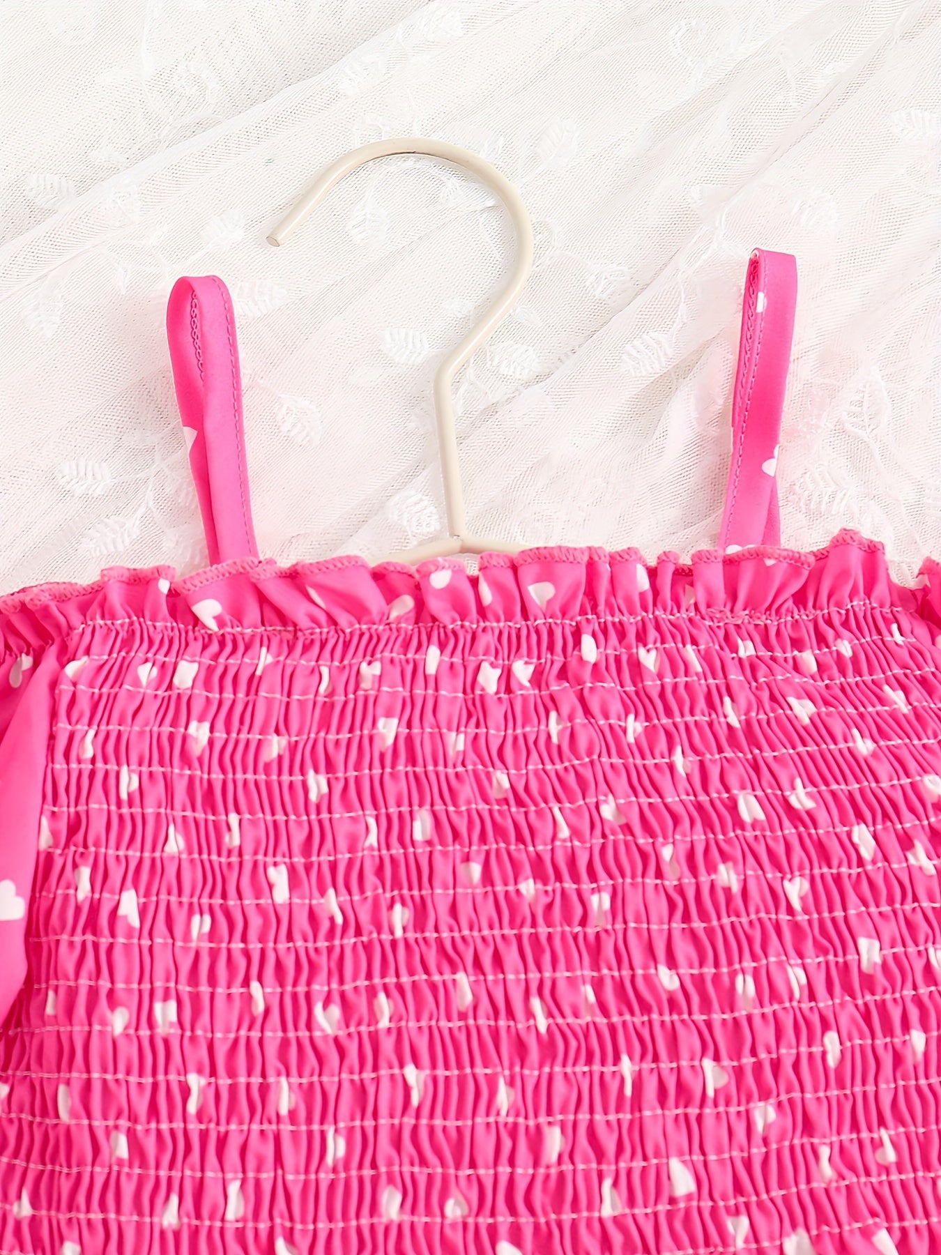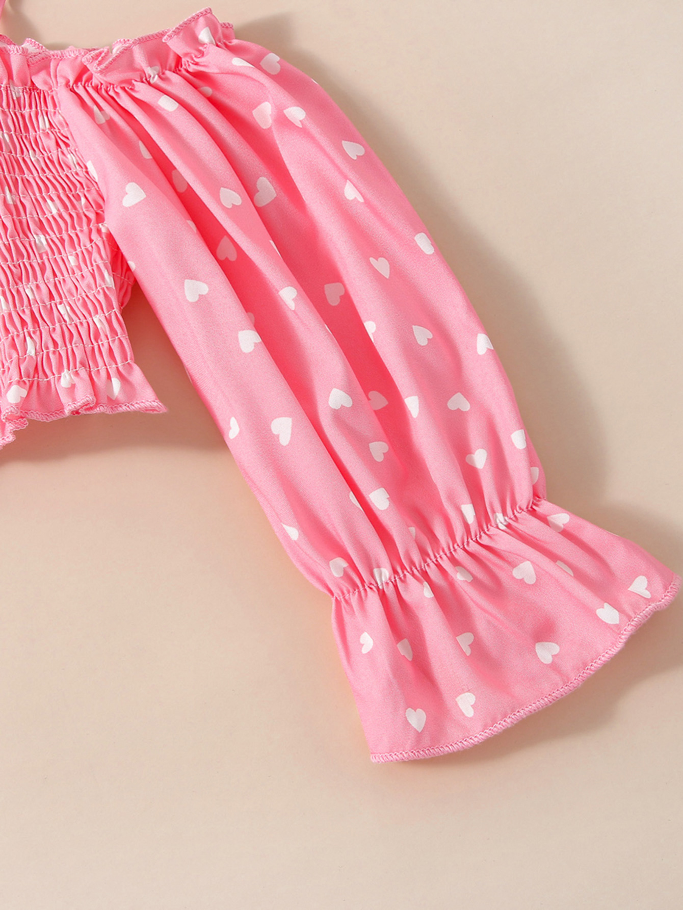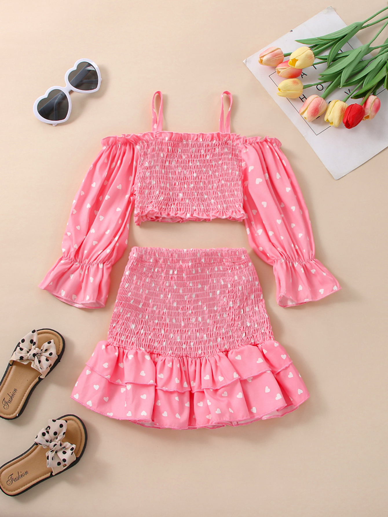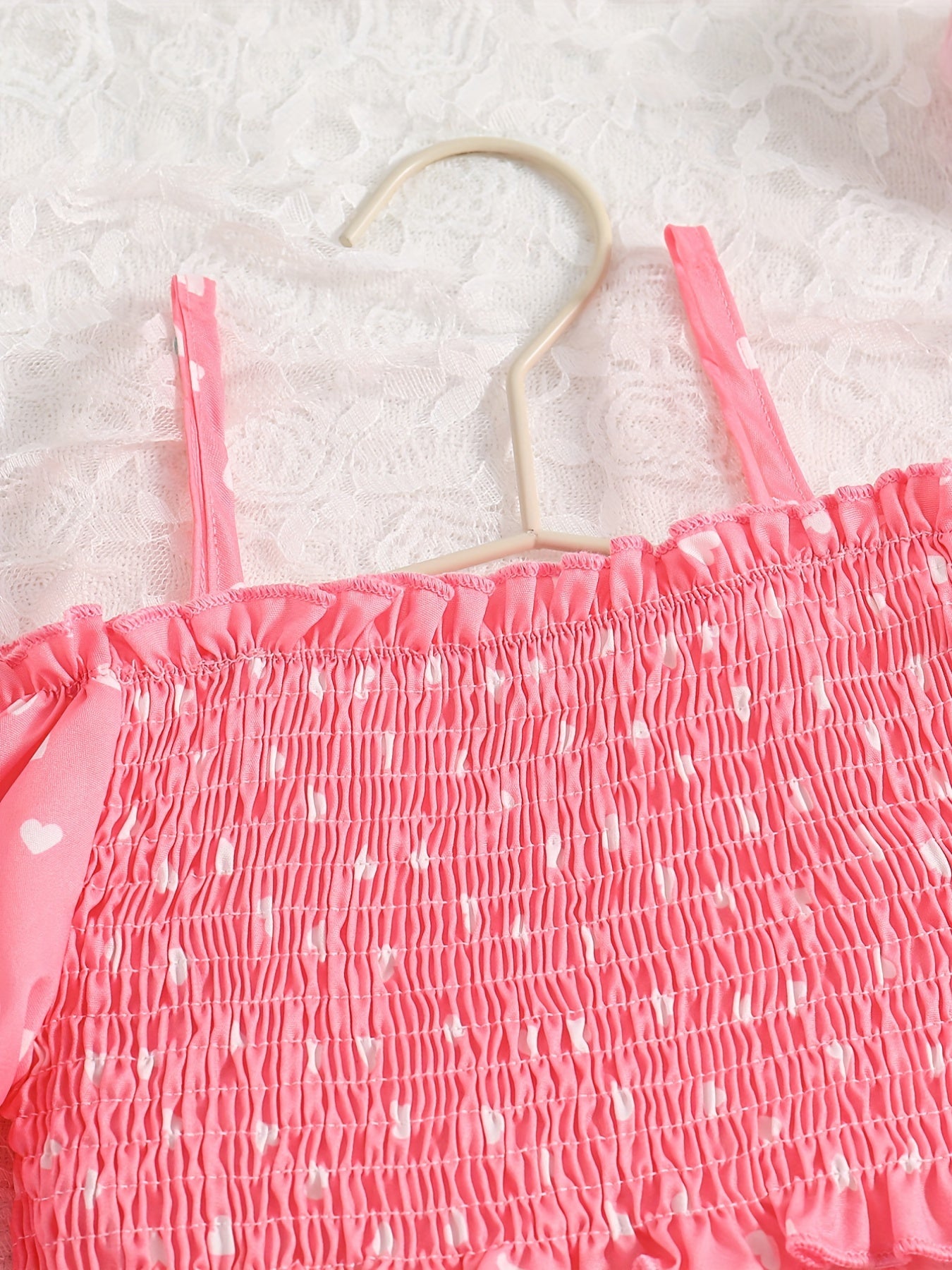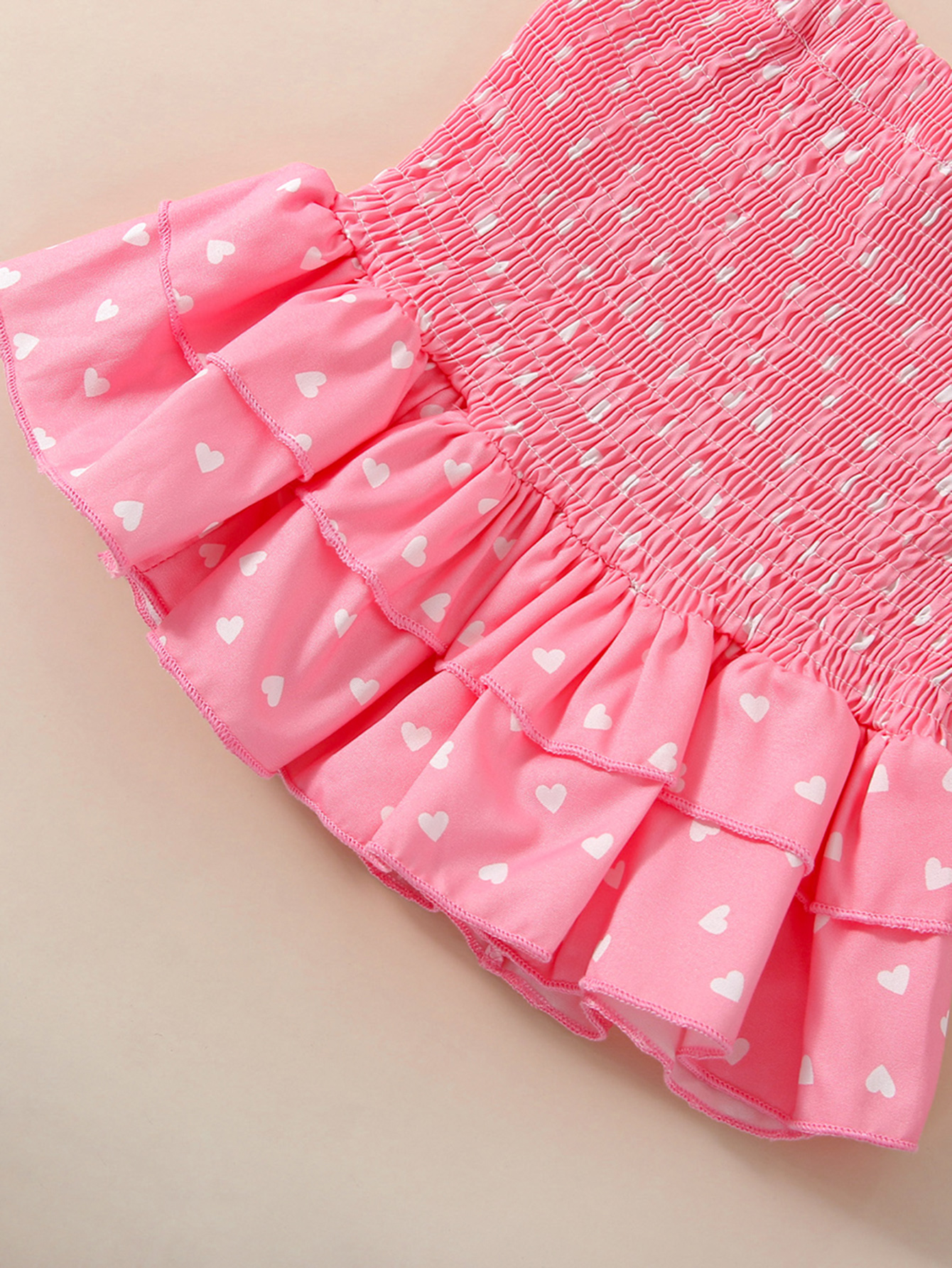 [Casual Heart Print Skirt Set] Casual Heart Print Ruffle Detail Girls' Knee-Length Skirt Set | Summer Dresses for Outdoor Attire