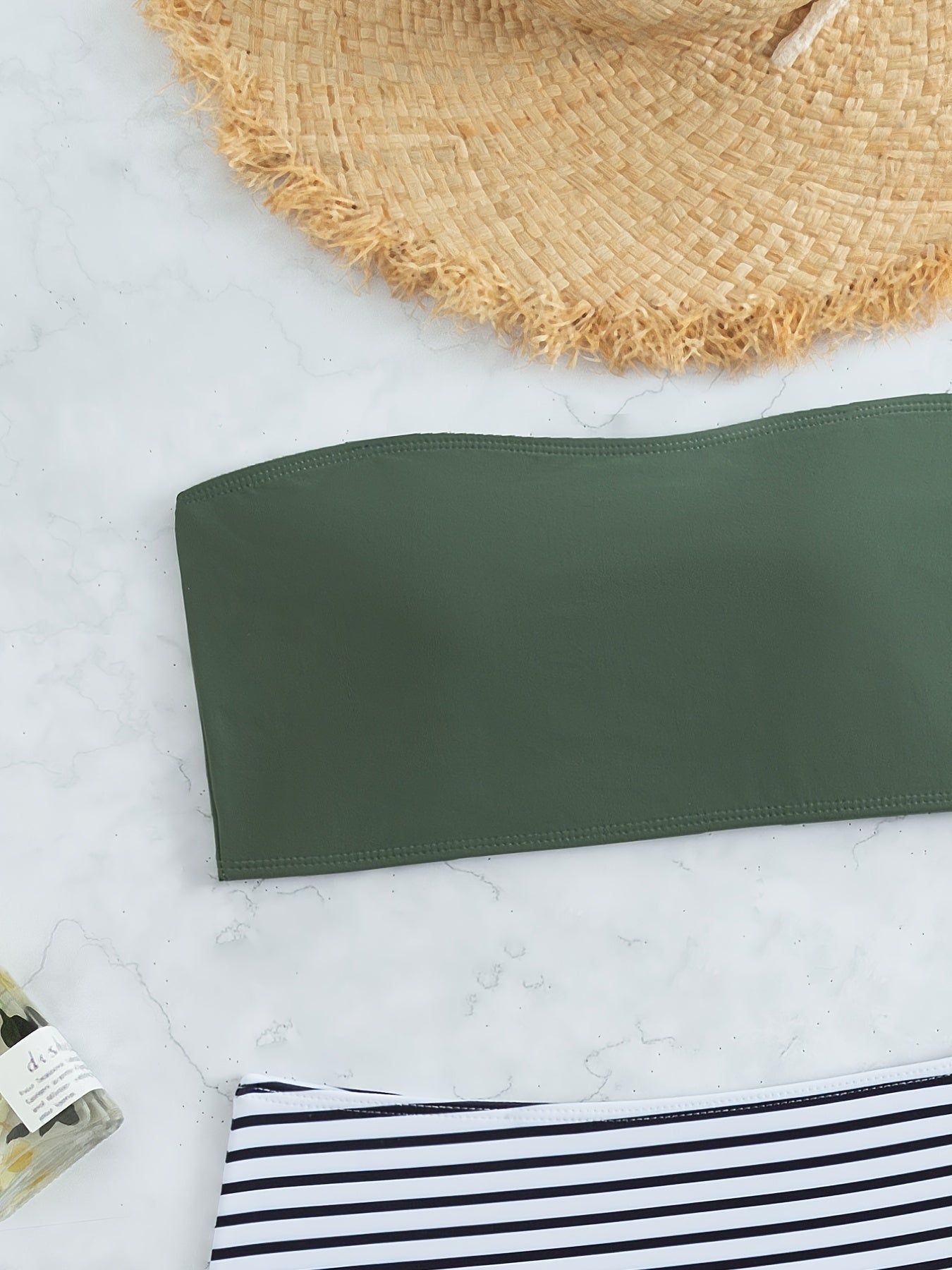 Striped Print Bandeau Two Piece Swimsuit, Army Green Strapless Tube Top, High Rise Black & White Striped Bottom Bikini Sets, Women's Swimwear & Clothing