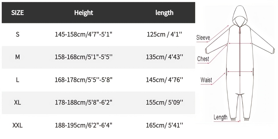 Please note: * Item: Onesie 1 (without any accessories) * Suitable for: Adults of any gender * This jumpsuit has a relaxed fit, and you can choose the size based on your height. If you like a more spacious fit or are unsure between two sizes, it's advisable to opt for the larger size.